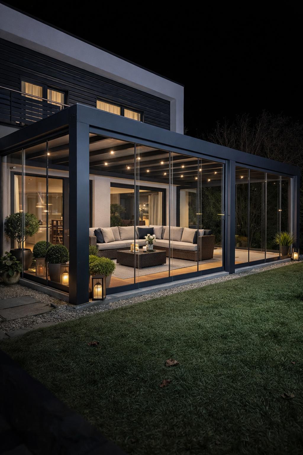 Die stabile Aluminiumkonstruktion sorgt für Langlebigkeit, hohe Stabilität und eine moderne Optik. In Kombination mit den Glasschiebeelementen lässt sich der Bereich flexibel öffnen oder schließen, wodurch ein angenehmes und geschütztes Ambiente entsteht. So wird Ihre Terrasse zu einem komfortablen Wohlfühlort für jede Jahreszeit.